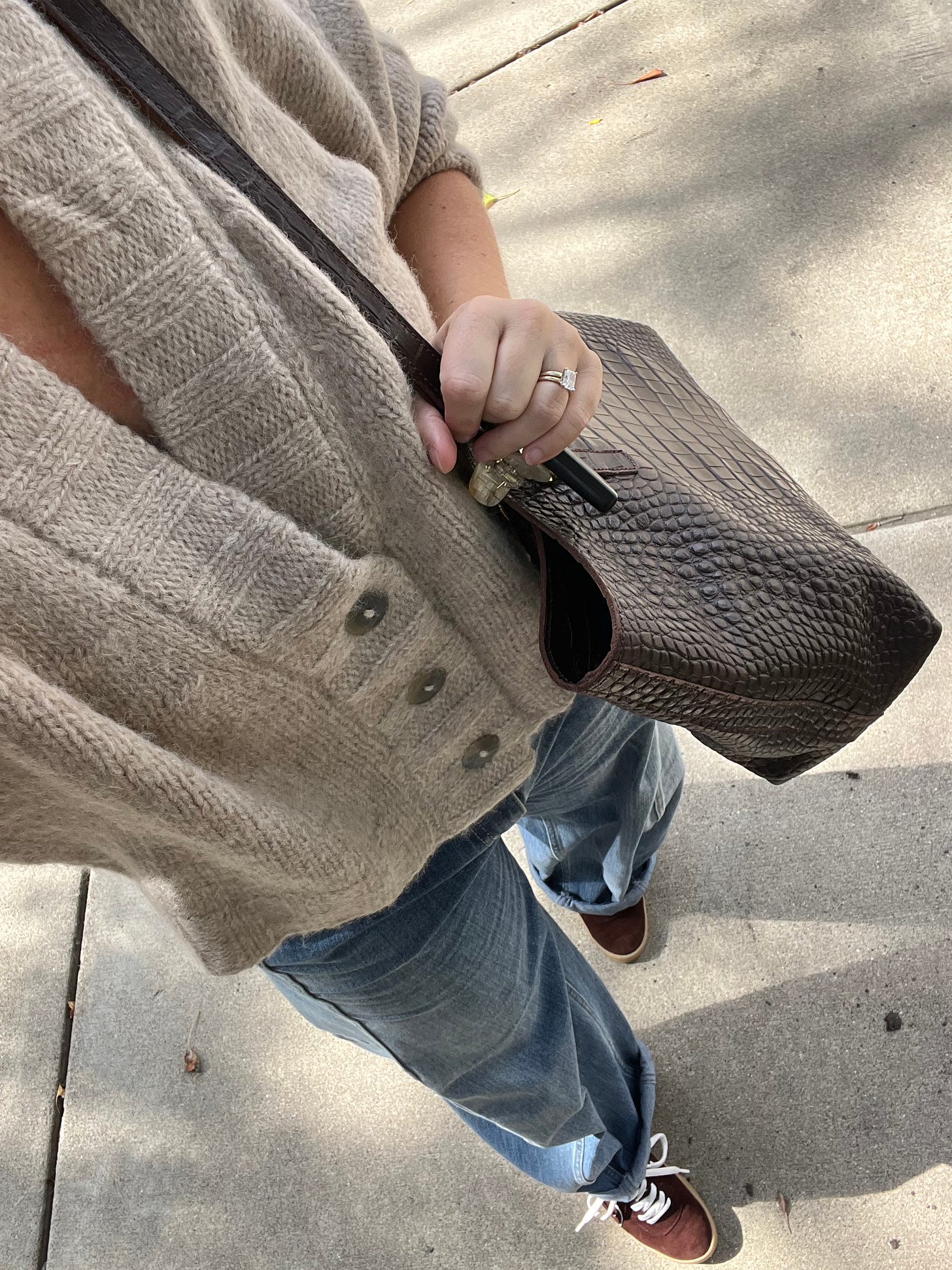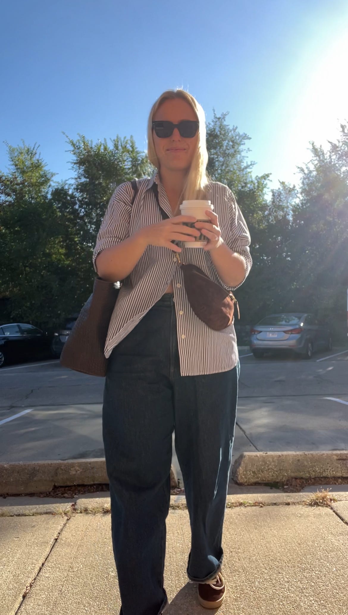 My shoes are in about three different places and I’m not ready to figure out where they are going in my closet yet, so I pulled out my chocolate suede sneakers knowing I’d be able to wear these with anything (and they’d be perfect with my chocolate suede Sling Bag). Practical, but giving me all the fall feels too.